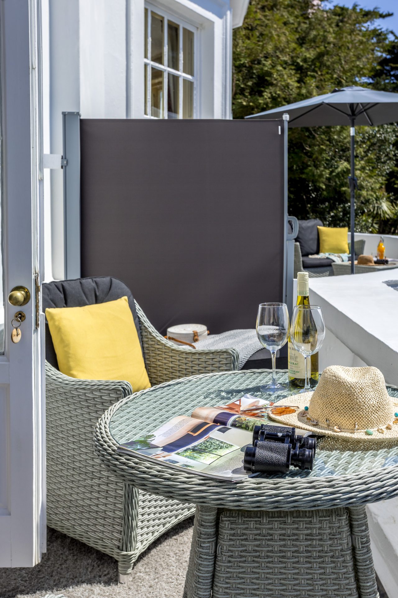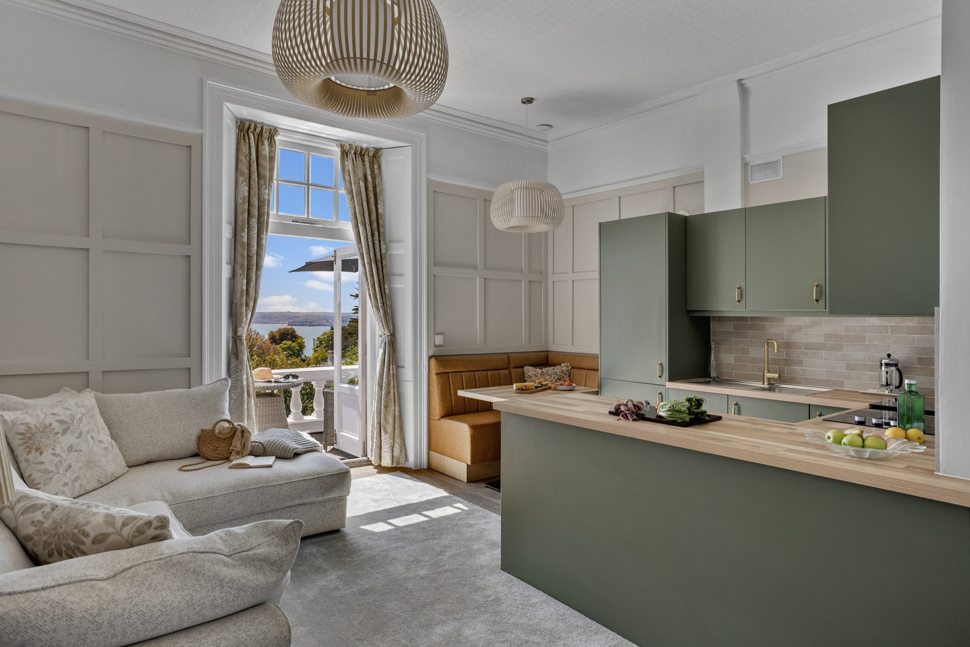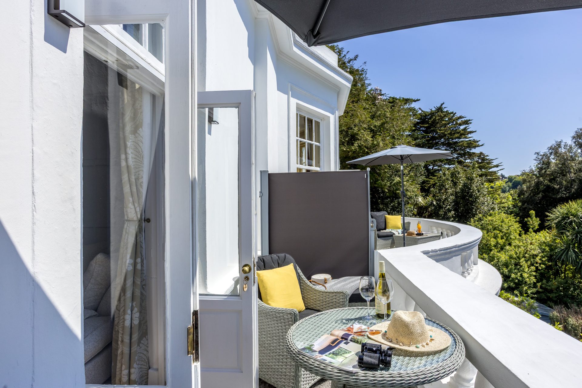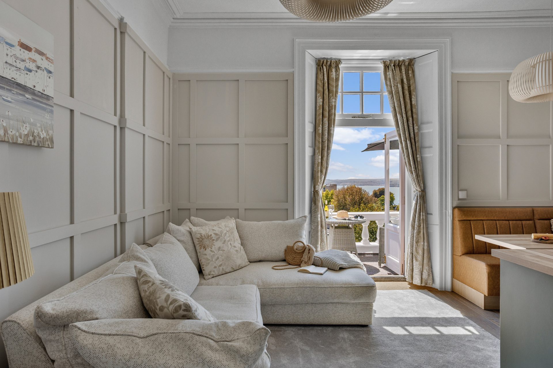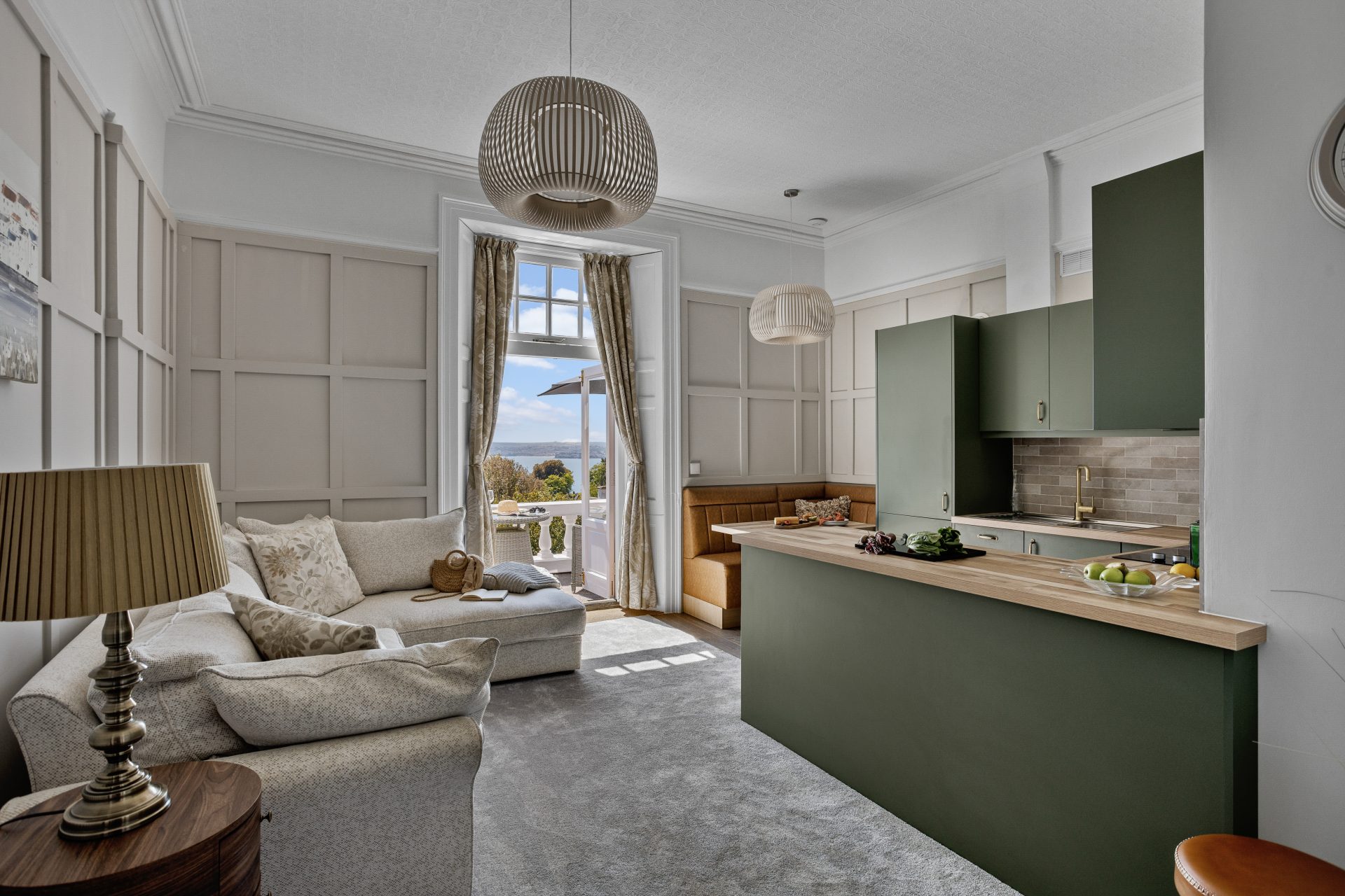 Open plan light and airy living area with corner sofa and dining table for four. Napoli has a fully equipped kitchen housing an oven, fridge with freezer compartment and microwave. French doors from the lounge open onto a private balcony with outside rattan bistro table, comfy chairs and sun parasol to enjoy stunning views over the gardens and sea beyond.
