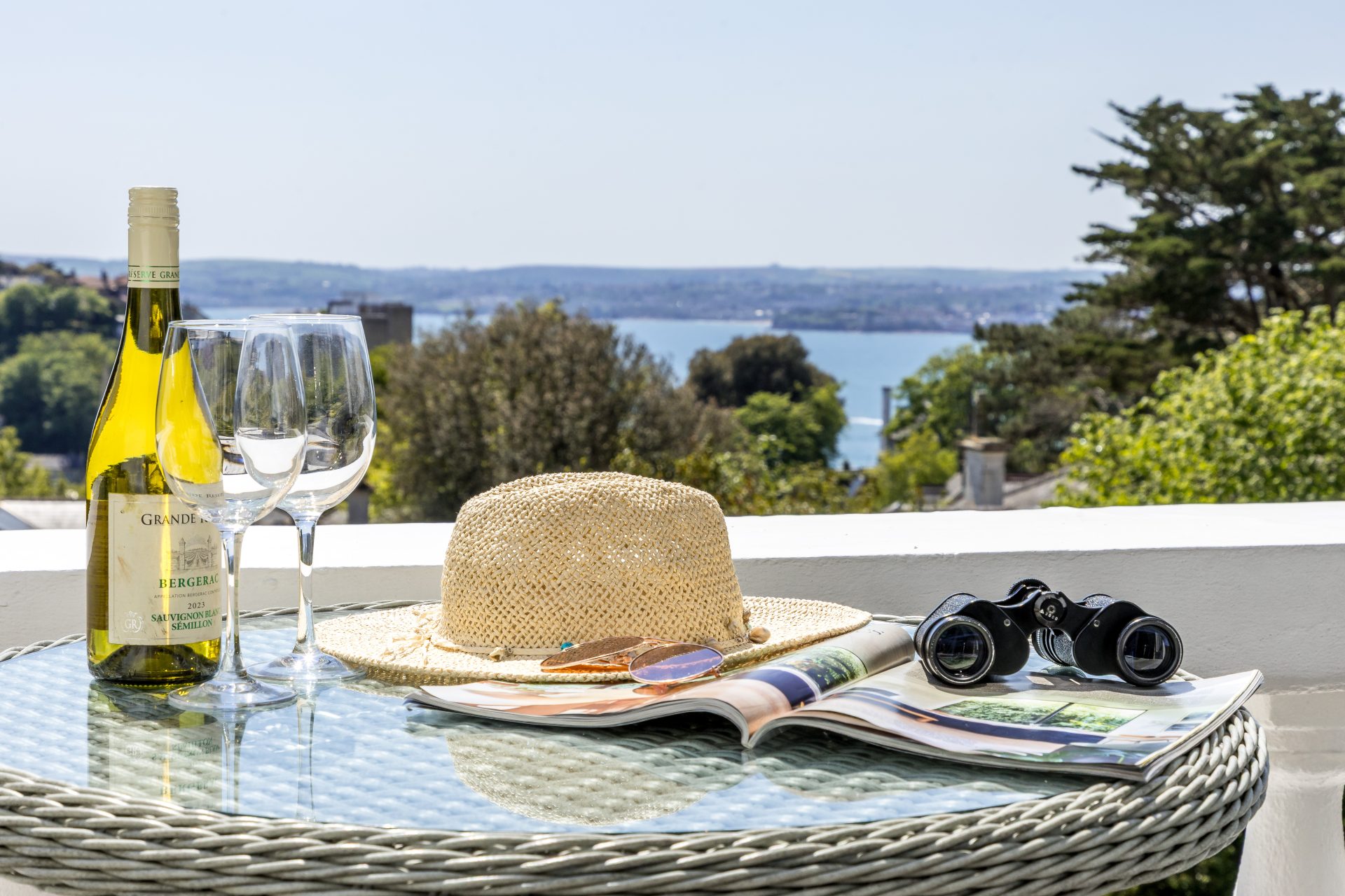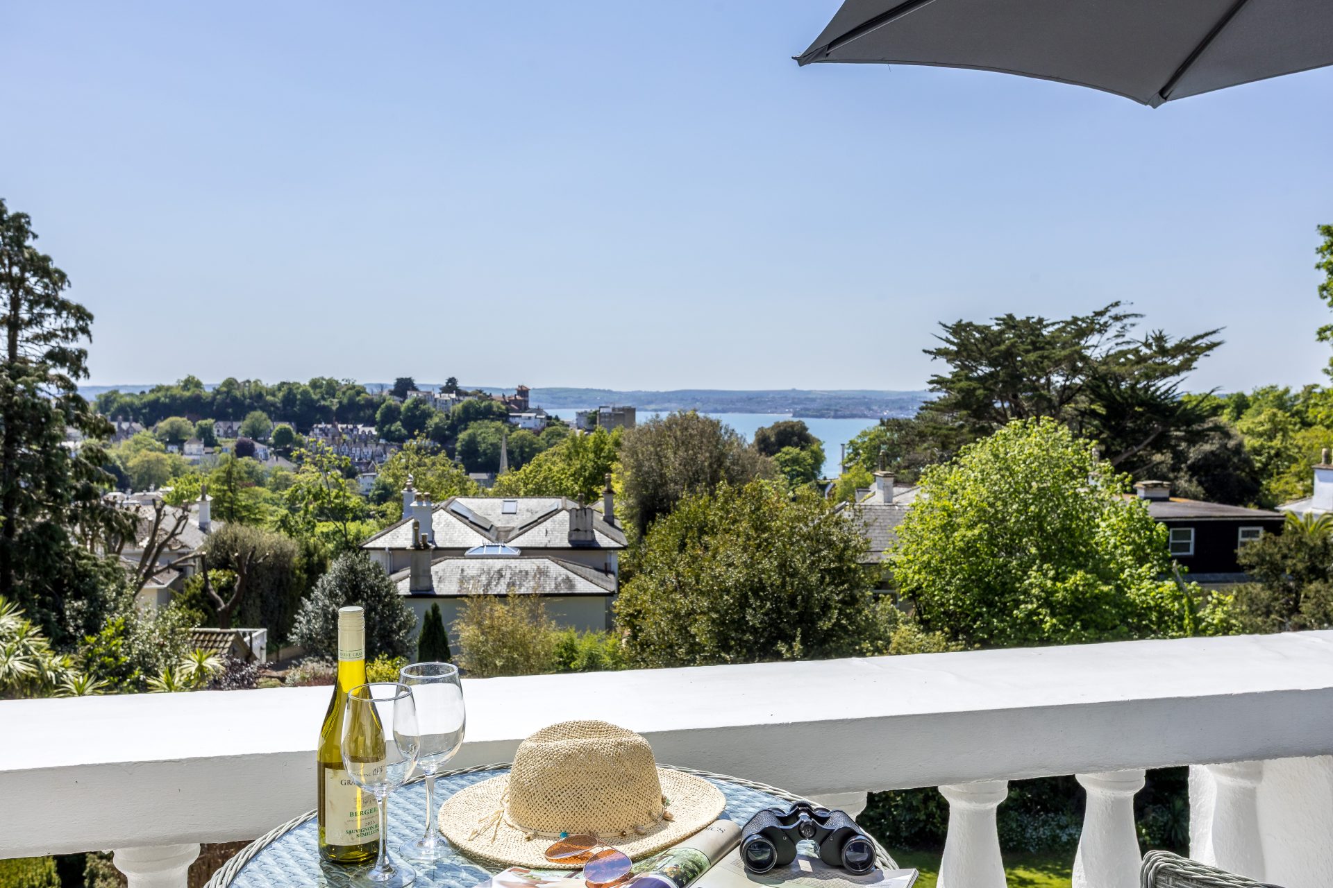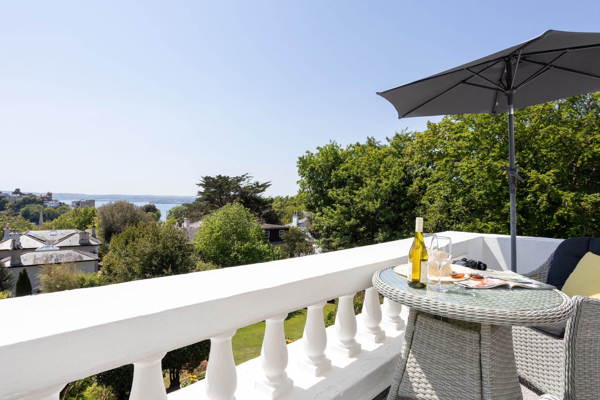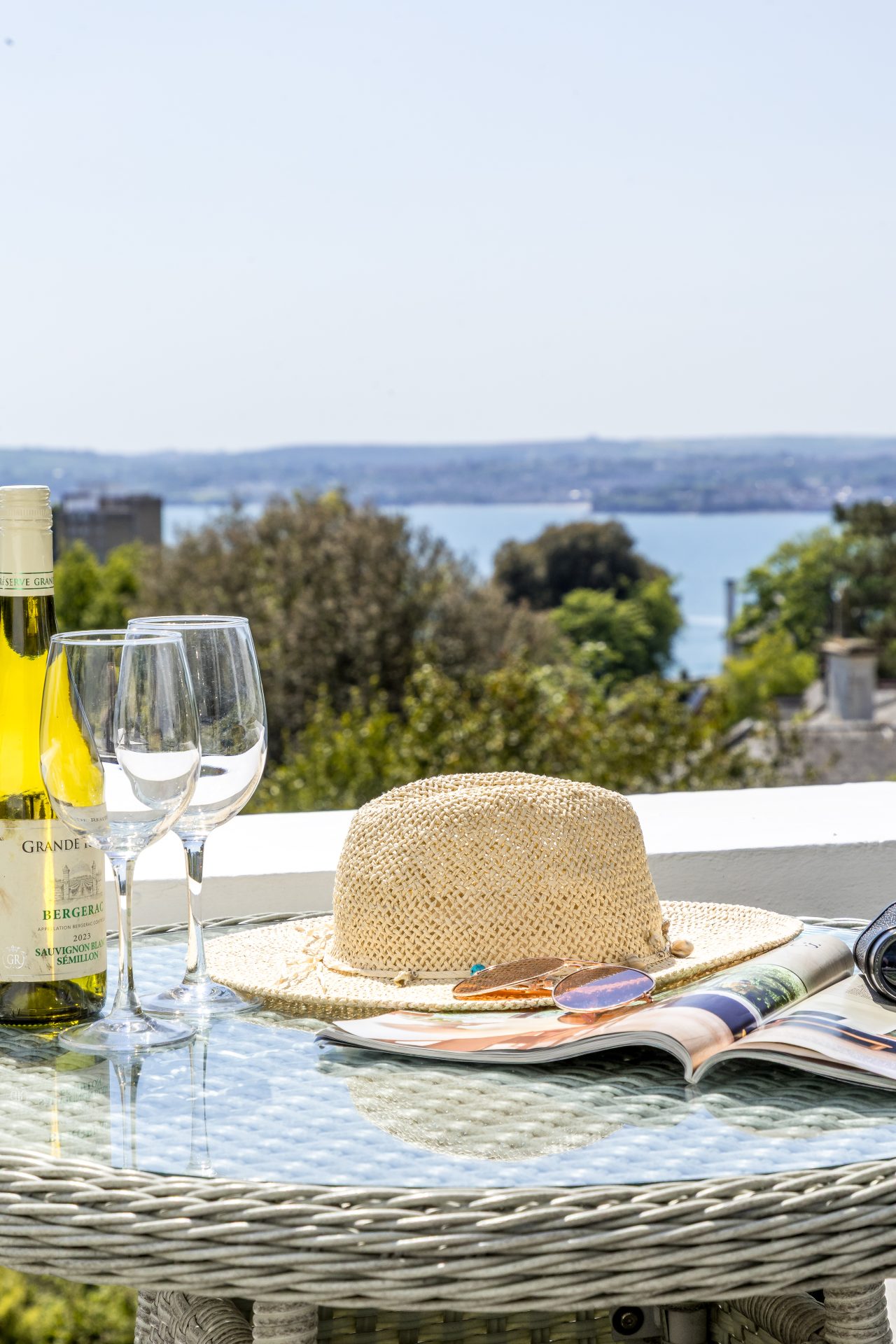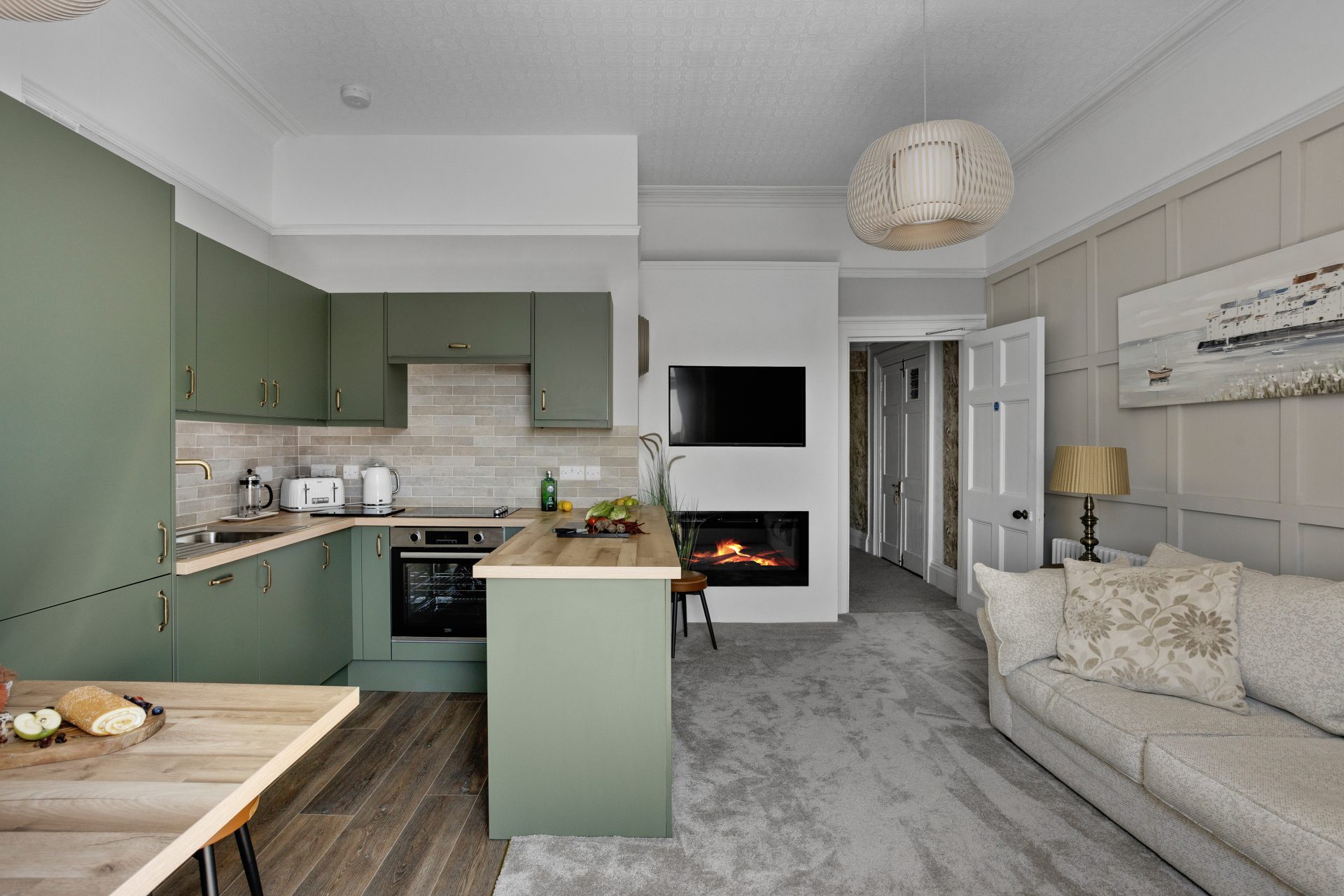 Open plan light and airy living area with corner sofa and dining table for four. Napoli has a fully equipped kitchen housing an oven, fridge with freezer compartment and microwave. French doors from the lounge open onto a private balcony with outside rattan bistro table, comfy chairs and sun parasol to enjoy stunning views over the gardens and sea beyond.